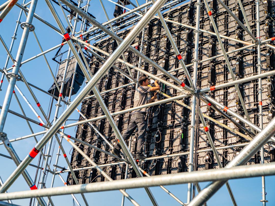 Začali sme podlahou pre kamióny. Vedeli sme, že aj keby teoreticky tri týždne nepršalo, čo sa nestáva, mohli by sme mať problém s transportnými vozidlami. Použili sme všetku mobilnú podlahu na Slovensku a doviezli ďalších 3000 m2 z Poľska. Druhá vec, ktorá sa dovážala na pole, boli kancelárske kontajnery, v ktorých sme už tretí deň inštalácie mali elektriku, internet, tlačiarne, počítače, kreslá, gauče a odtiaľ pracovali. Potrebovali sme priamo na mieste vyjsť z tej bunky, vidieť plochu celú pred sebou, navigovať dodávateľov a podobne.