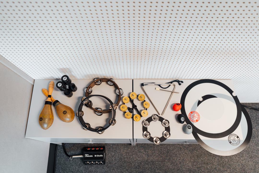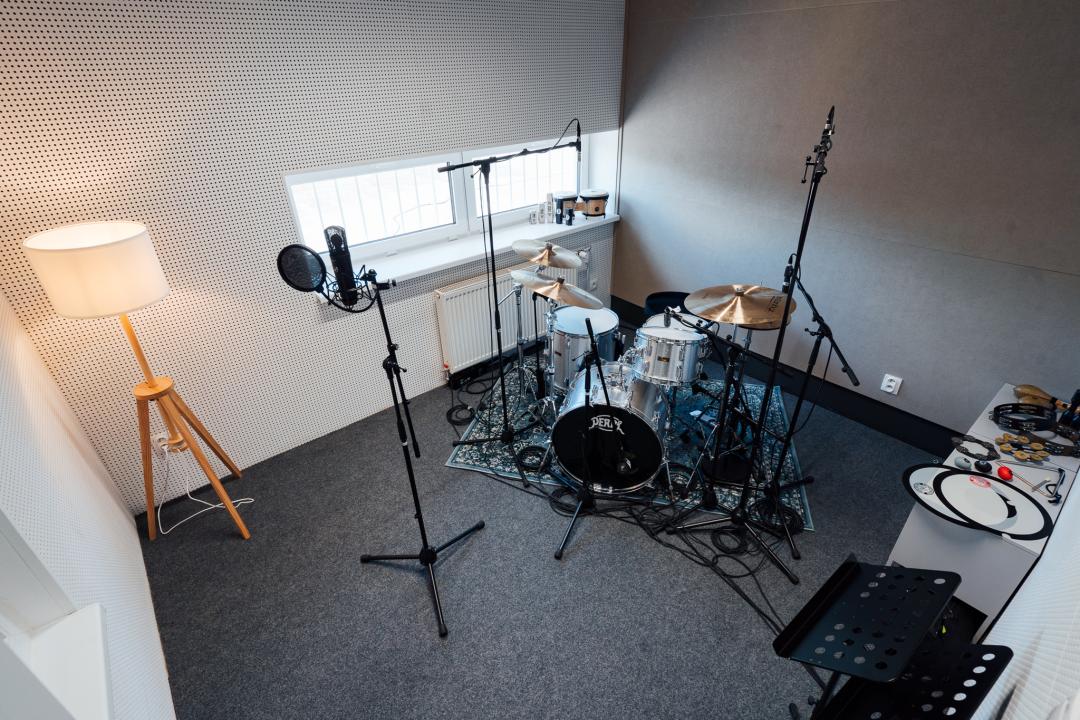 Samozrejmosťou sú bicie a kopec perkusií, ktoré sú vždy namikrofónované, pripravené na nahrávanie. Stačí si priniesť svoj notebook. Pokročilé technológie nahrávacieho štúdia si samozrejme vyžadujú malé školenie, ktoré poskytujeme členom na úvodnom stretnutí, aby medzi hudobným nápadom a realizáciou už nestála žiadna prekážka.